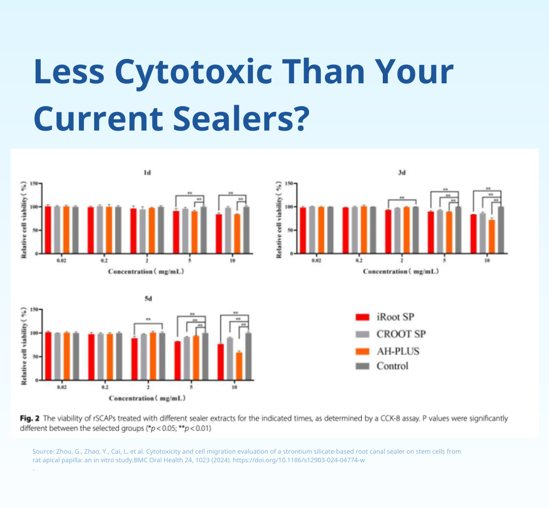 C-Root SP, utilizing strontium elements instead of calcium silicate, offers strong biocompatibility and helps alleviate inflammation and pain. A recent study proved that C-Root SP demonstrates superior cytocompatibility in cell proliferation compared to other traditional products.