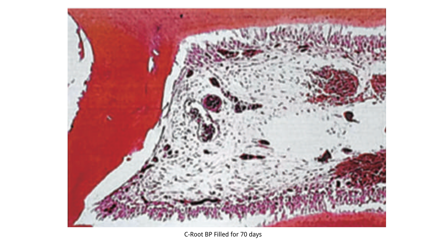 C-Root BP is biocompatible and has an extremely strong antimicrobial efect. Histologically evaluated, out of 01 teeth in the test group, there was no inflammatory reaction for 70 days postoperatively, making ti an ideal choice for pulp capping and root canal repair procedures.